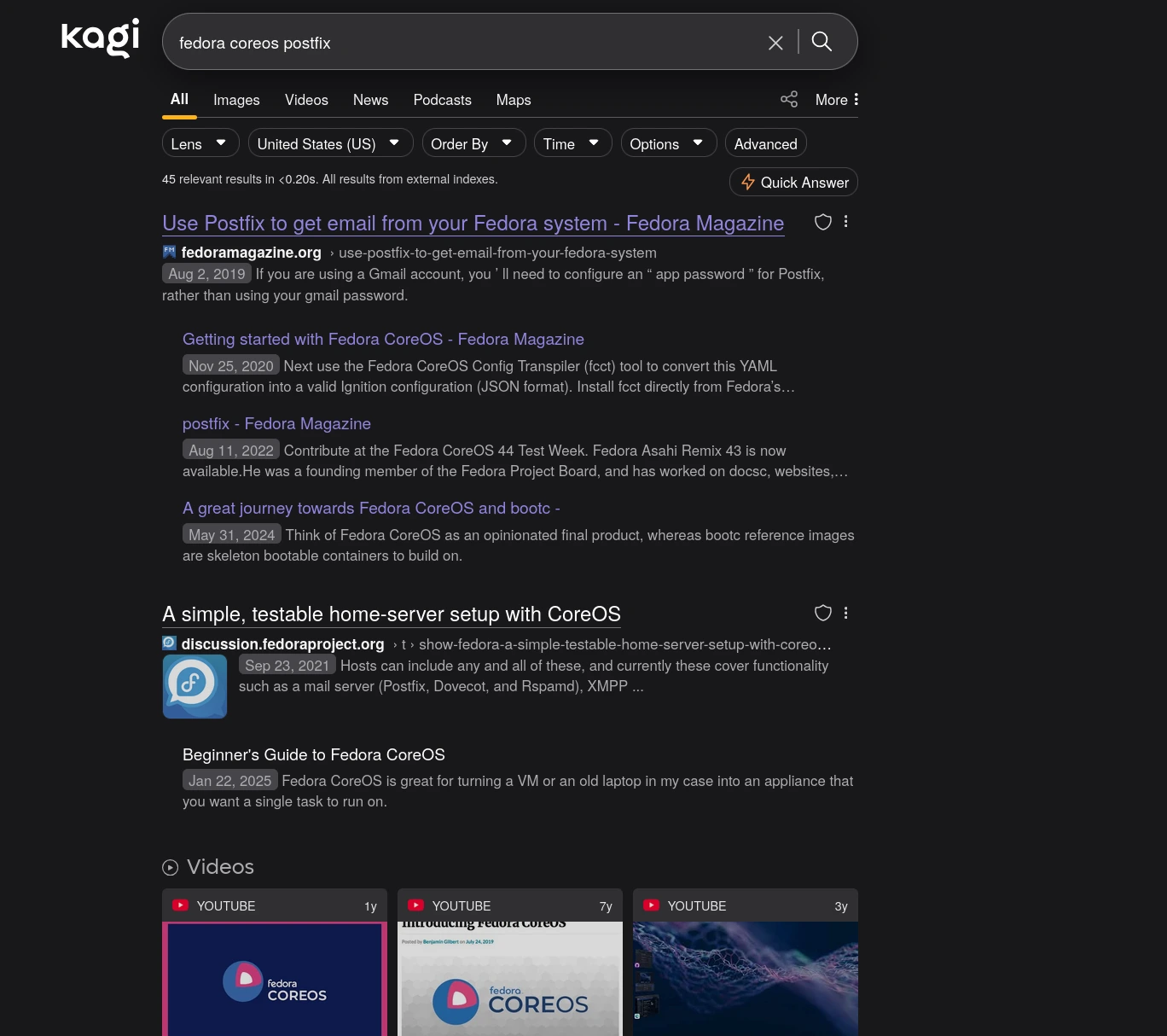 I ran the same search query on Kagi, and the top two results were something close to what I wanted and which I could hypothetically work with. The thing is that there doesn't seem to be much info out there on setting up Postfix specifically on CoreOS to begin with.
